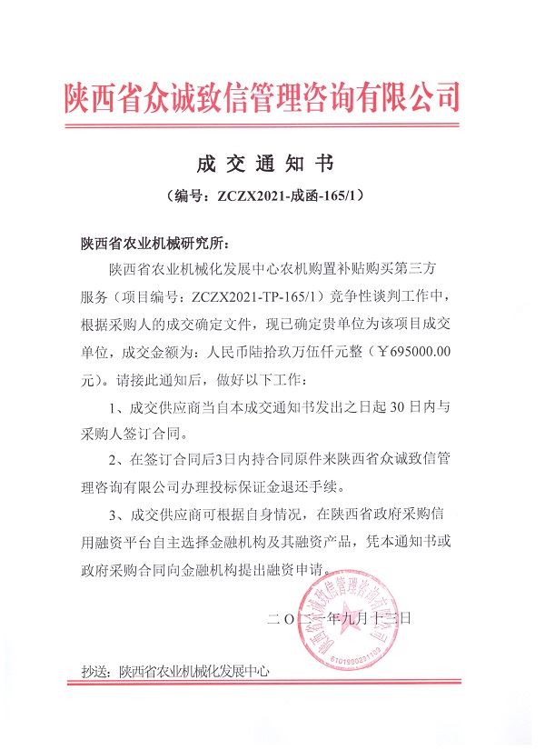 根據(jù)陜西省農(nóng)業(yè)機械化發(fā)展中心農(nóng)機購置補貼購買第三方服務競爭性談判公告(項目編號:ZCZX2021-TP-165/1),我所迅速組織人員團結協(xié)作,高效地完成了響應文件的編制,并按期遞交至陜西省眾誠致信管理咨詢有限公司。最終經(jīng)談判小組評審推薦,確定我所為該項目供應商。