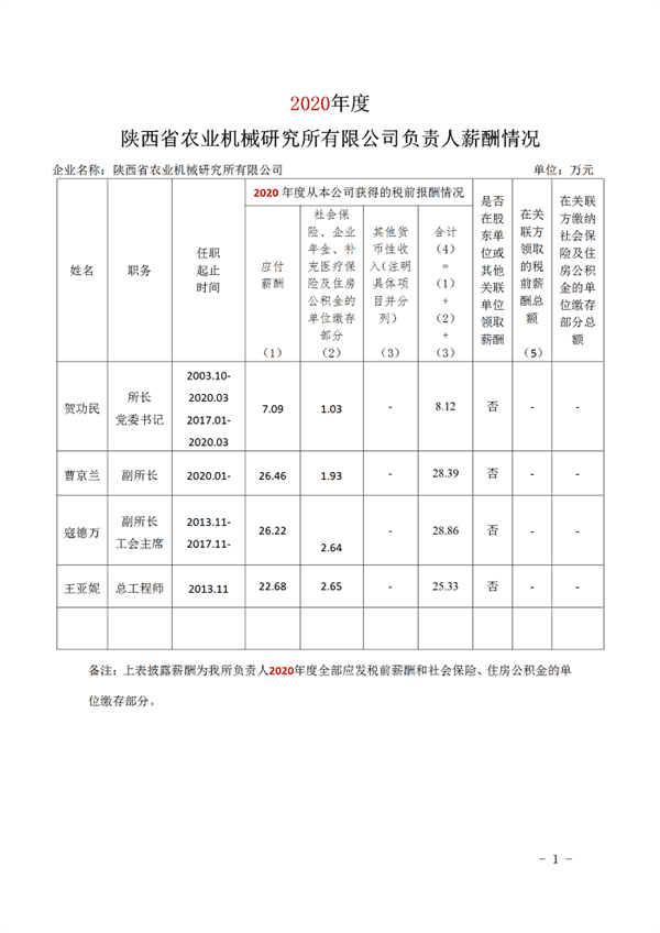 2020年度陜西省農(nóng)業(yè)機械研究所有限公司負責(zé)人薪酬情況