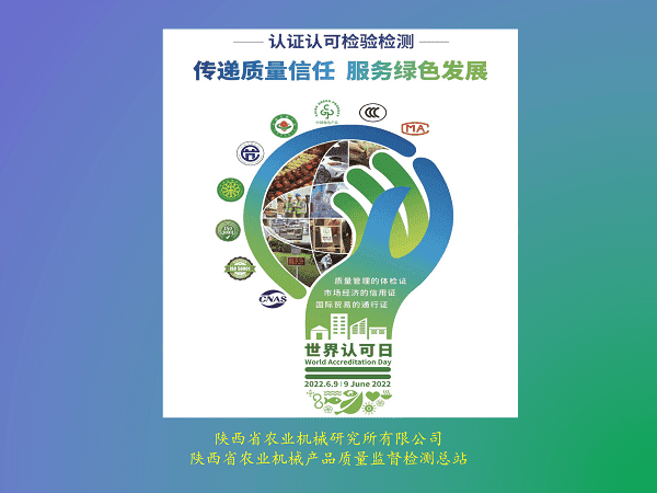 2022年6月9日是第十五個“世界認可日”,陜西省農(nóng)業(yè)機械產(chǎn)品質(zhì)量監(jiān)督檢測總站以圍繞“認證認可檢驗檢測:傳遞質(zhì)量信任,服務(wù)綠色發(fā)展”的主題,開展“世界認可日”主題學習活動。