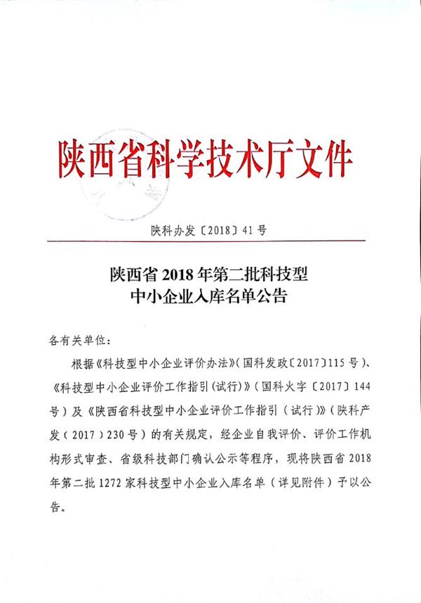 根據(jù)《科技型中小企業(yè)評(píng)價(jià)辦法》(國(guó)科發(fā)政〔2017〕115號(hào))、《科技型中小企業(yè)評(píng)價(jià)工作指引(試行)》(國(guó)科火字〔2017〕144號(hào))及《陜西省科技型中小企業(yè)評(píng)價(jià)工作指引(試行)》(陜科產(chǎn)發(fā)﹝2017﹞230號(hào))的有關(guān)規(guī)定,我所在科技型中小企業(yè)評(píng)價(jià)系統(tǒng)上進(jìn)行自我評(píng)價(jià)、經(jīng)陜西省科學(xué)技術(shù)廳審查,被評(píng)定為陜西省科技型中小企業(yè),于2018年3月15日在陜西科技信息網(wǎng)上公示。