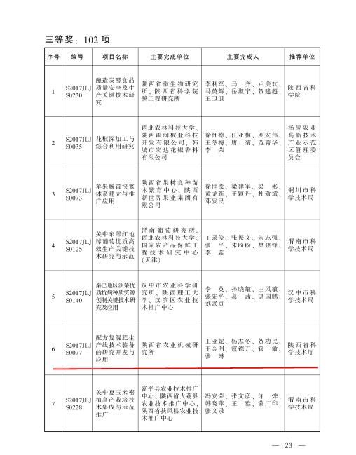 根據(jù)《陜西省人民政府關(guān)于2017年度科學技術(shù)獎勵的決定》(陜政發(fā)[2018]10號),陜西省農(nóng)業(yè)機械研究所“配方復混肥生產(chǎn)線技術(shù)裝備的研究開發(fā)與應用”科技成果,榮獲2017年度陜西省科學技術(shù)獎三等獎。